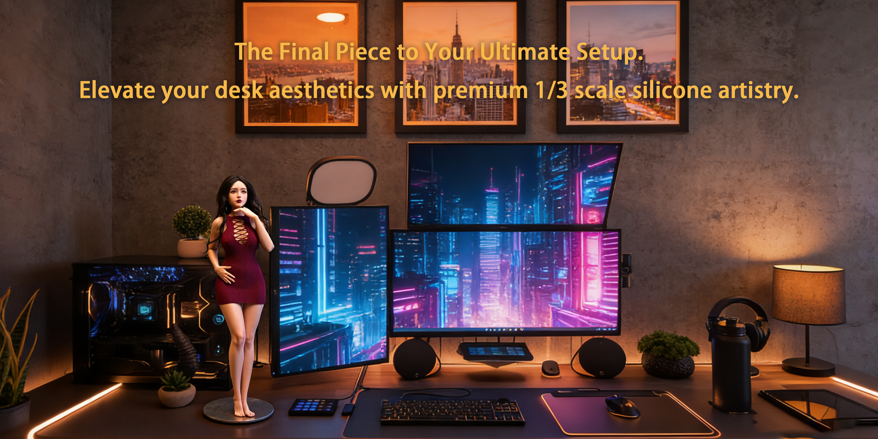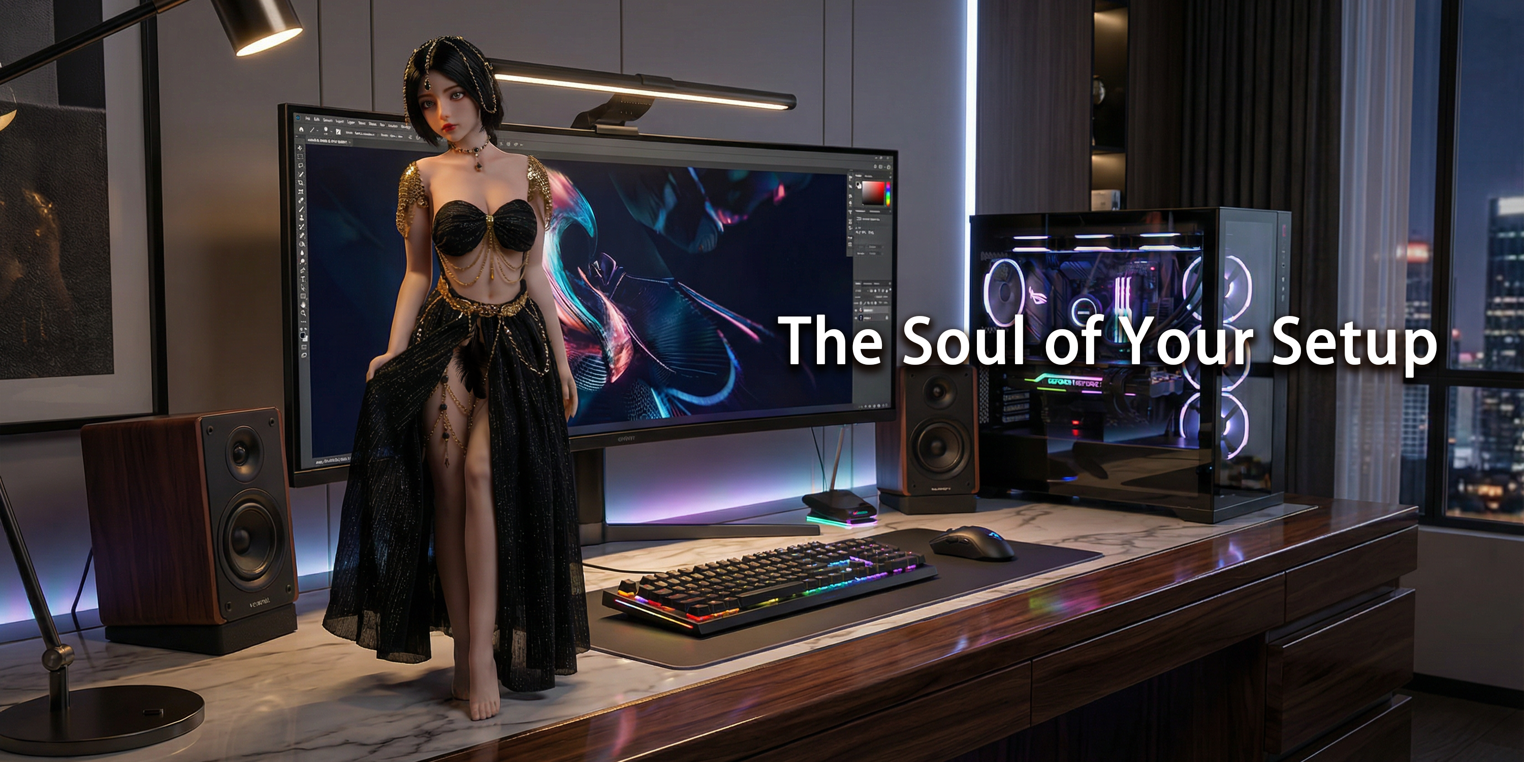 "Complete your digital sanctuary. Amidst cold hardware, she is the organic soul—a lifelike art piece designed to elevate your aesthetic and bring warmth to the workspace you’ve built."