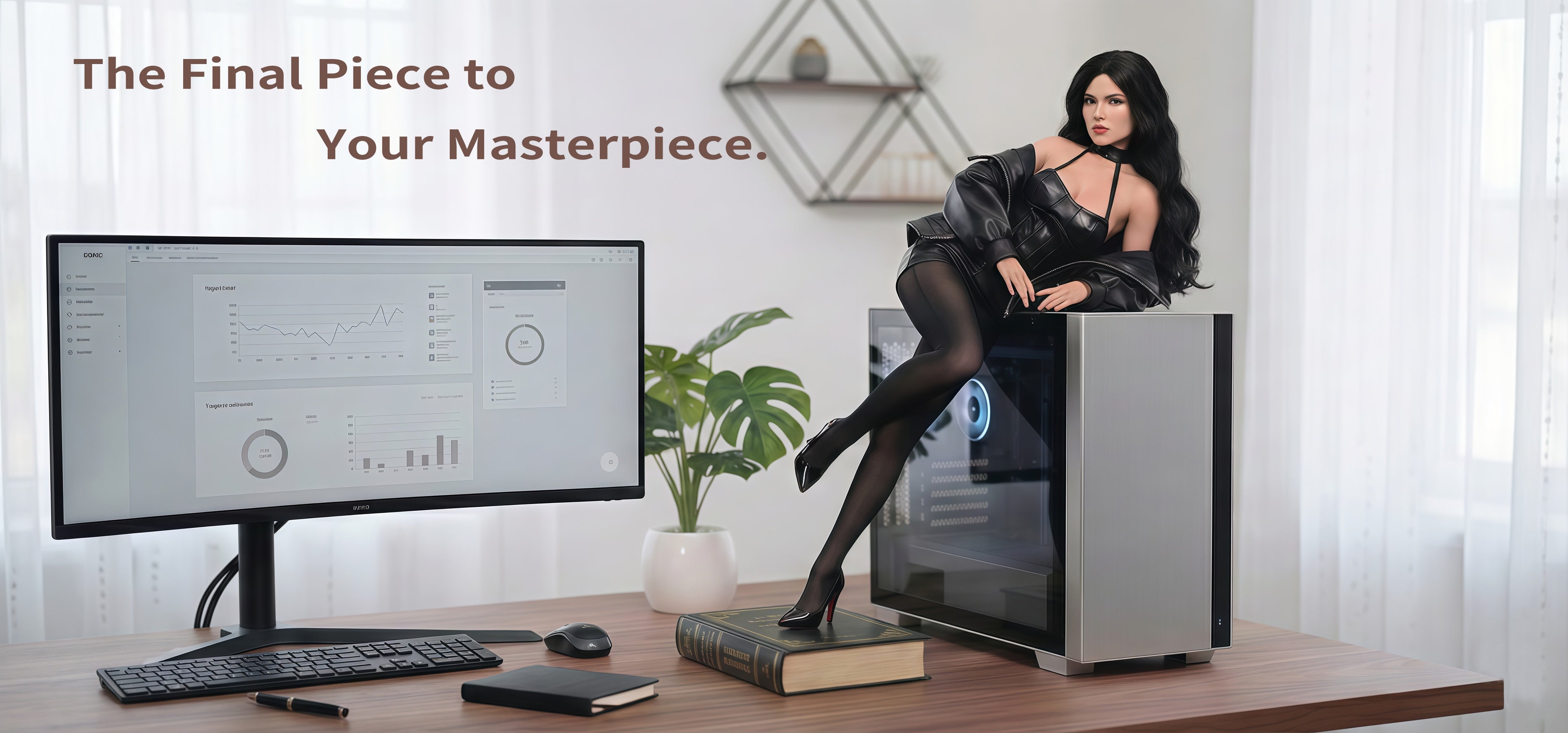 "Complete your digital sanctuary. Amidst cold hardware, she is the organic soul—a lifelike art piece designed to elevate your aesthetic and bring warmth to the workspace you’ve built."