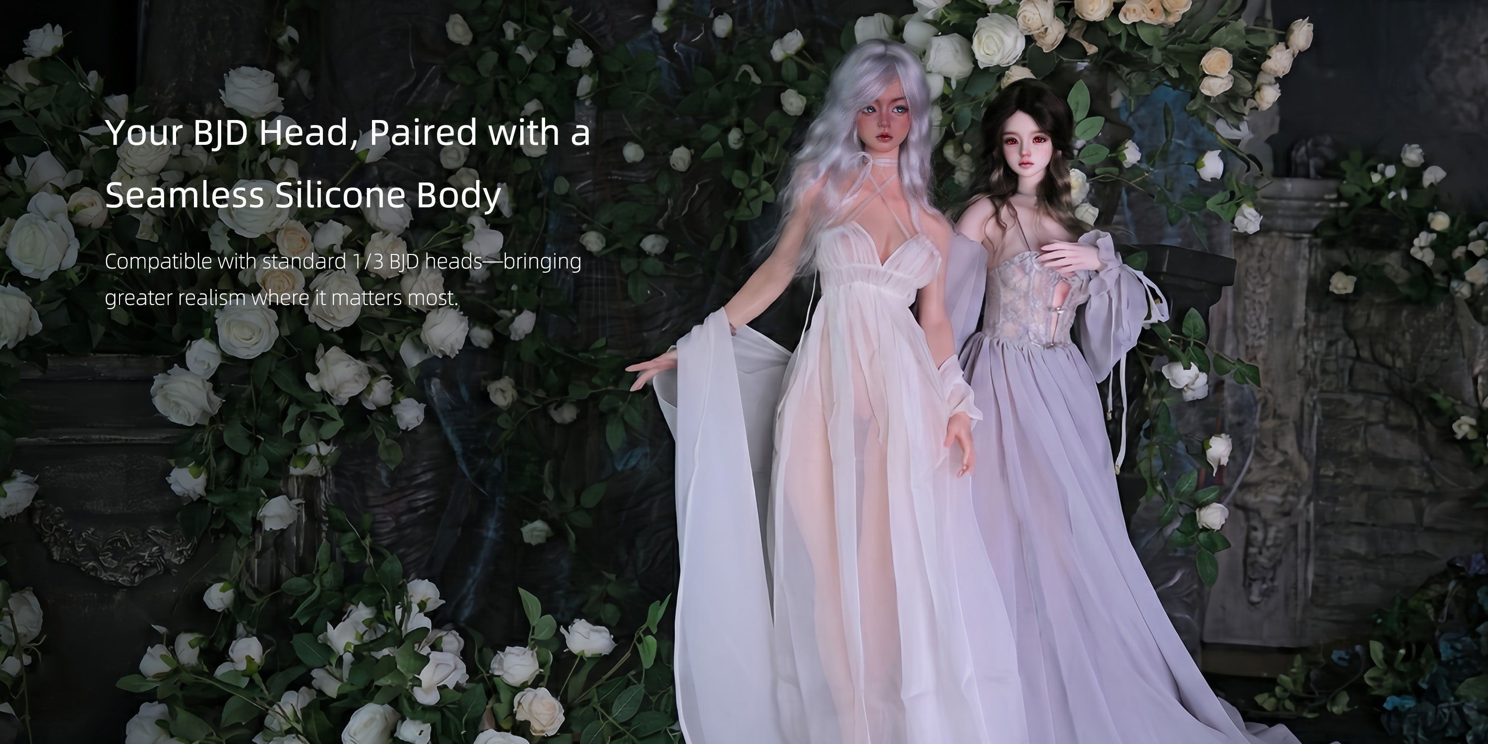 Install your favorite 1/3 scale BJD head on our seamless silicone body for a lifelike, realistic form—while keeping all the creative freedom and custom face-ups your BJD head offers.