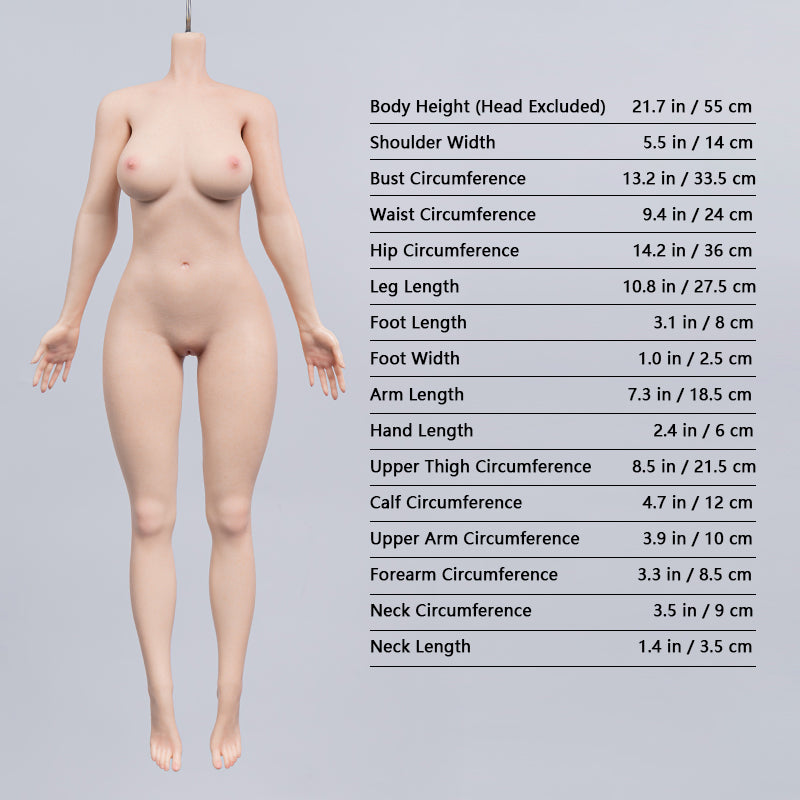 Premium seamless silicone body with an internal articulated skeleton, designed to allow the installation of 1/3 BJD heads. -